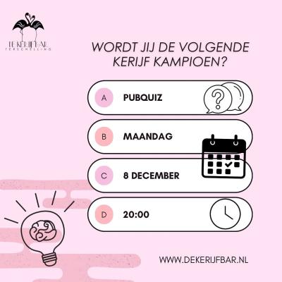 02-12-2025 18:27 |  | Pubquiz! Aanstaande maandag kan je weer de bolleboos worden in de Pubquiz van de Kerijfbar! Meld je team ( max 4 personen) snel aan via de email of loop even binnen. Deelname € 5,- per team. Meer info |
