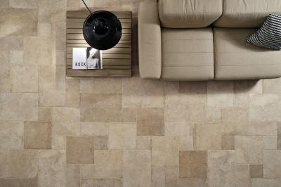 Castle Taupe een module vloer (romaansverband) in 4 formaten in de mix gelegd. Meer info