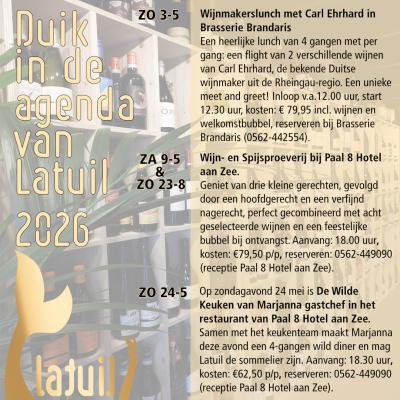 13-04-2026 10:52 |  | WIJNMAKERSLUNCH MET CARL EHRHARD BRASSERIE BRANDARIS. Lunch:4gangen met Carl Ehrhard wijnen&uitleg van de wijnmaker. Start 12.30u,€79,95p/p incl.wijnen&welkomstbubbel, reserveren Brasserie:0562-442554 Meer info