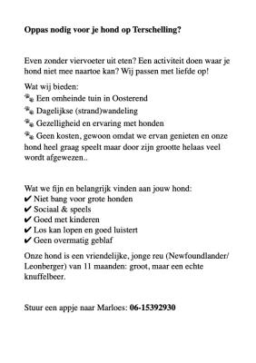 01-10-2025 10:31 |  | Heb jij lieve, actieve hond en zoek je af en toe een (vakantie)oppas voor een (halve)dag? Even zonder viervoeter naar de wal? Een activiteit doen waar je hond niet bij kan? Zie bijlage |