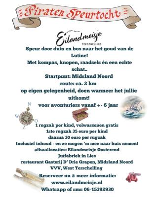 01-10-2025 10:35 |  | Tip voor de herfstvakantie: ga met de kinderen op zoek naar het goud van de Lutine op de piratenspeurtocht in Midsland Noord. Zelfstandig te doen wanneer jullie uitkomt. Geschikt vanaf circa 6 jaar. Meer info |