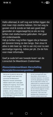 08-11-2025 19:09 |  | | Brillen op sterkte voor een goed doel. Voor deze keer kan je bij mij brillen op sterkte inleveren. Jij hebt vast ook nog wel wat liggen. Zie informatie foto |